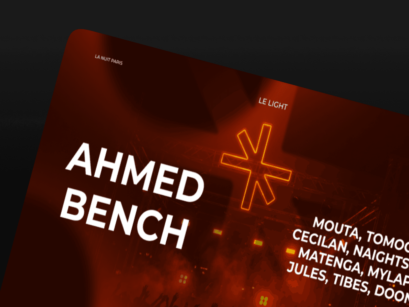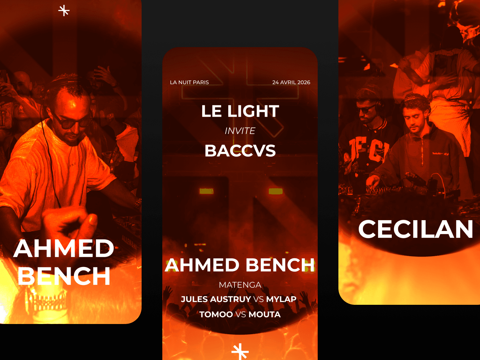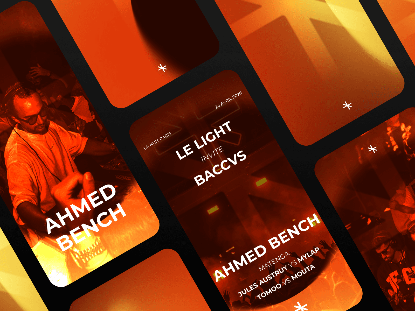 Cette soirée house réunissait sur une même scène Mouta, Tomoo, Cecilan, NIGHTSEA, MATENGA, Ahmed Bench, MYLAP, Jules, Tibes et DOON — chacun porteur d'une énergie propre, d'un rapport singulier au dancefloor. Le défi côté direction artistique était clair : créer un univers visuel capable de fédérer ces identités sans les uniformiser. Trouver le fil graphique qui relie sans enfermer. Chaque support — affiche, story, bannière — devait donner le ton avant même que le premier kick ne résonne.