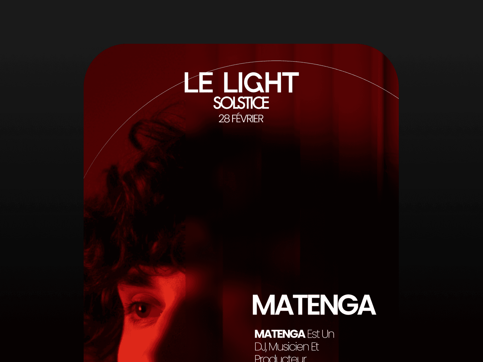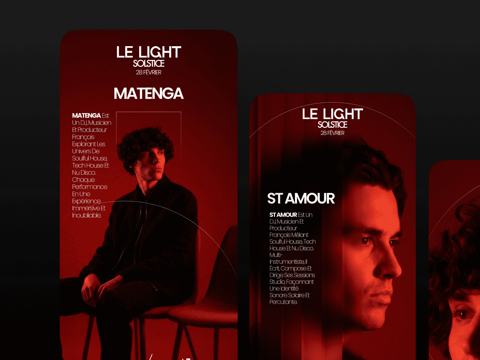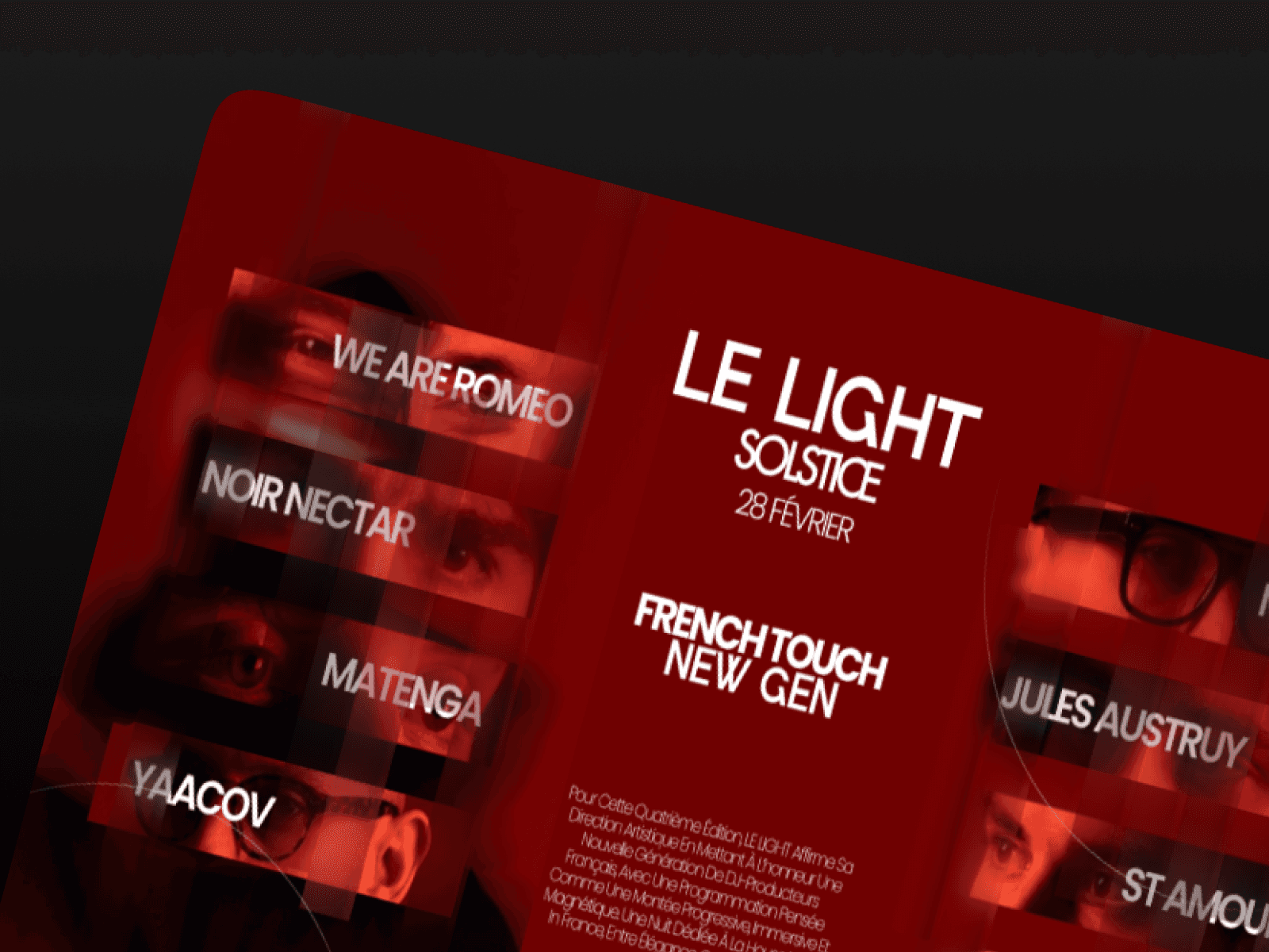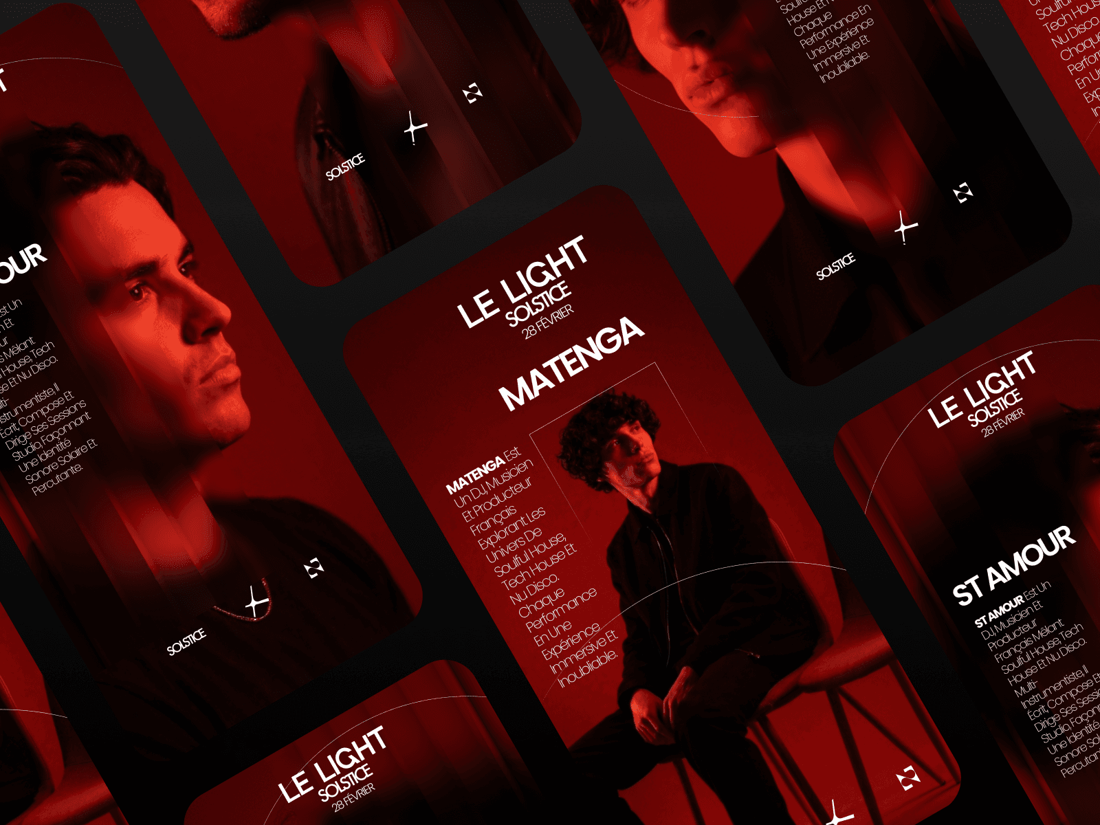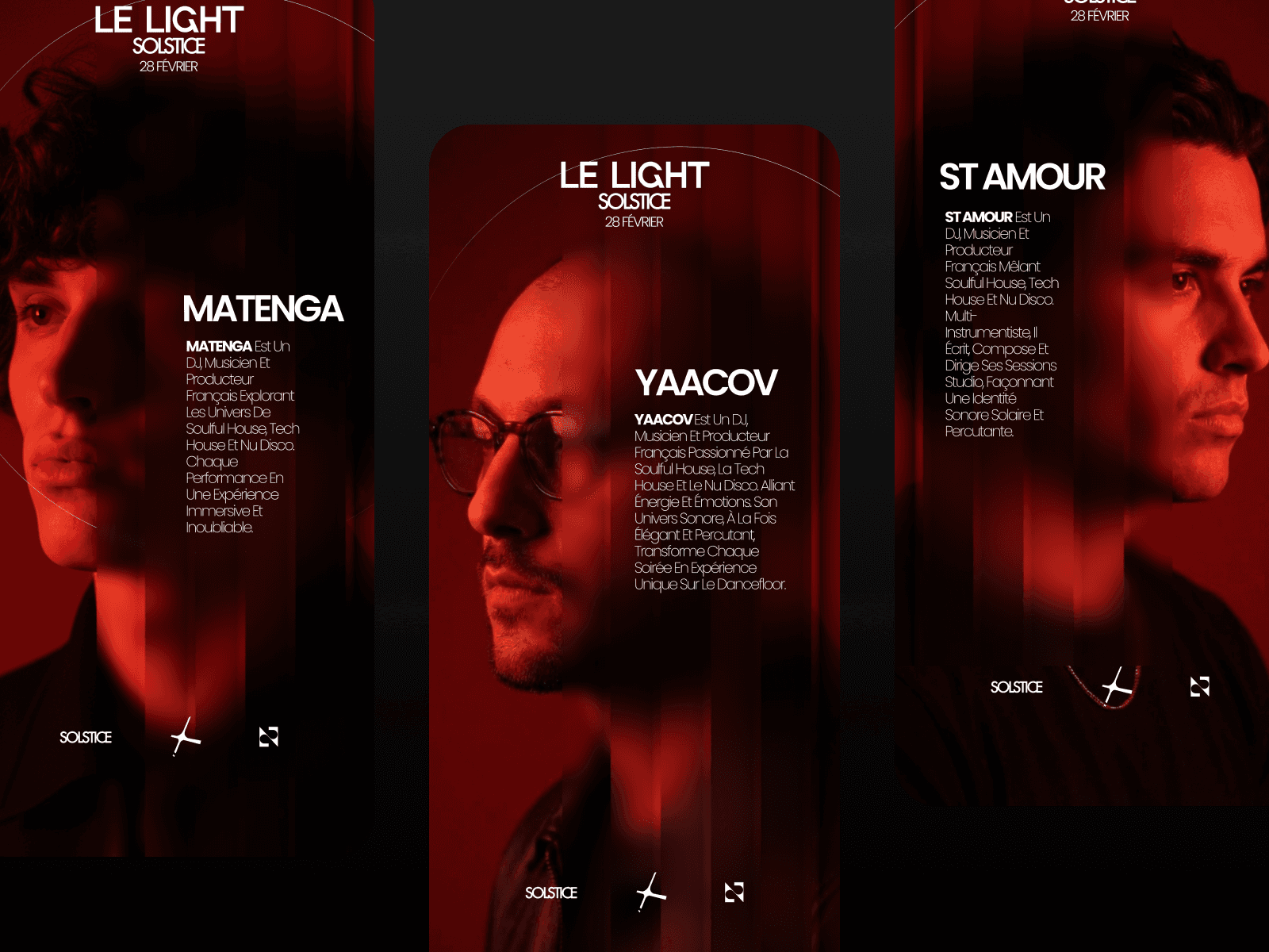 Cette soirée house réunissait sur une même scène Yacoov, Matenga, ST Amour, Mylap, Jules — chacun porteur d'une énergie propre, d'un rapport singulier au dancefloor. Le défi côté direction artistique était clair : créer un univers visuel capable de fédérer ces identités sans les uniformiser. Trouver le fil graphique qui relie sans enfermer. Chaque support — affiche, story, bannière — devait donner le ton avant même que le premier kick ne résonne.